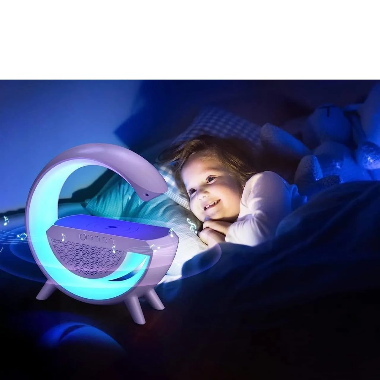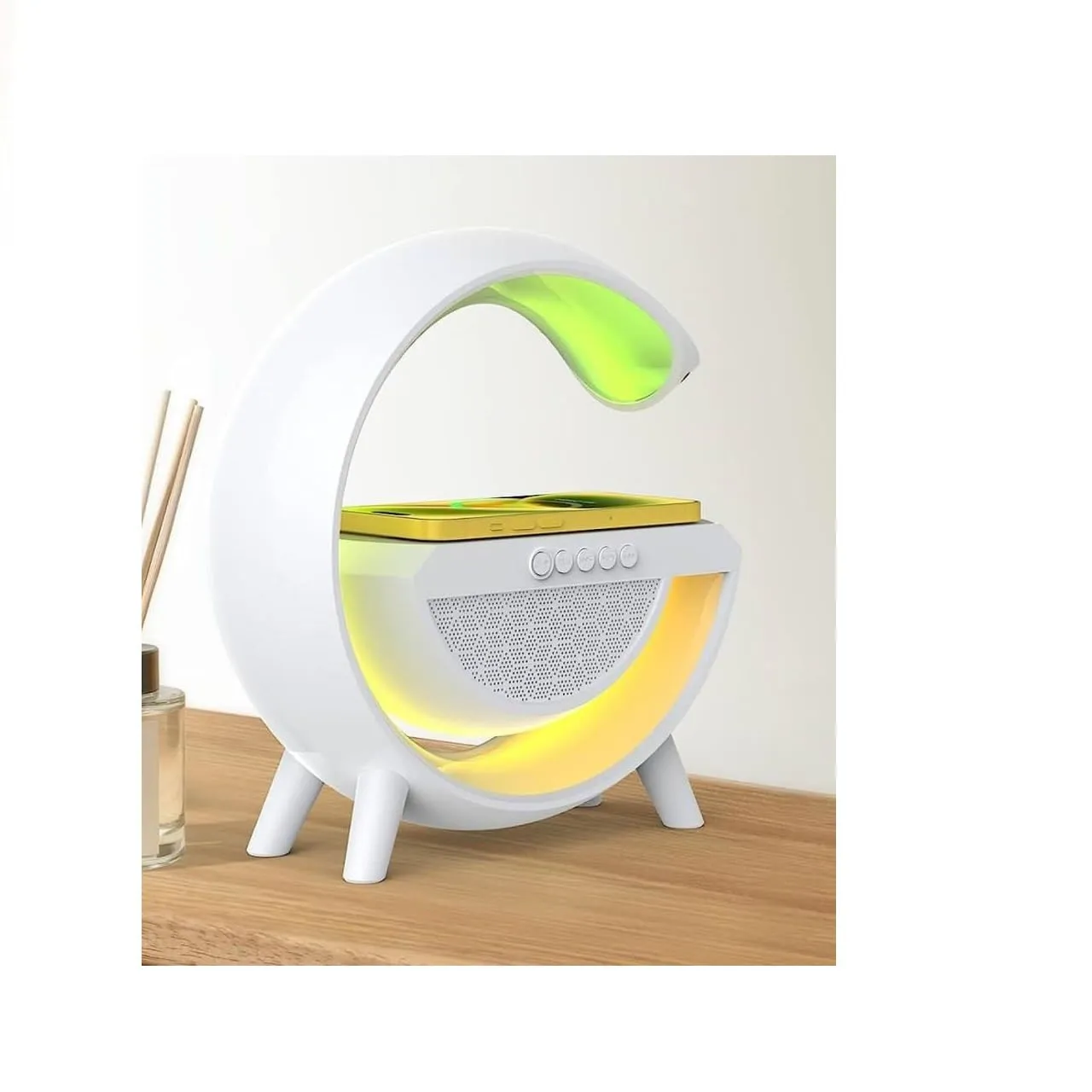Multi-Functional Design – Combines wireless charging, Bluetooth speaker, LED lamp, and FM radio in a single G-shaped device.