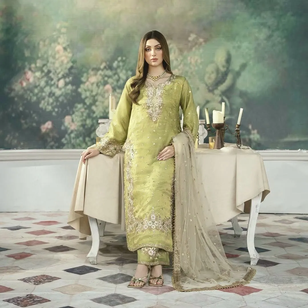 Elevate your ethnic wardrobe with this Golden Olive Embellished Pakistani Suit Set, a timeless ensemble radiating grace and luxury. Crafted from premium chiffon and silk-blend fabric, this outfit is adorned with delicate zari, sequin, and bead embroidery, making it an exquisite choice for weddings, festive gatherings, and grand occasions.