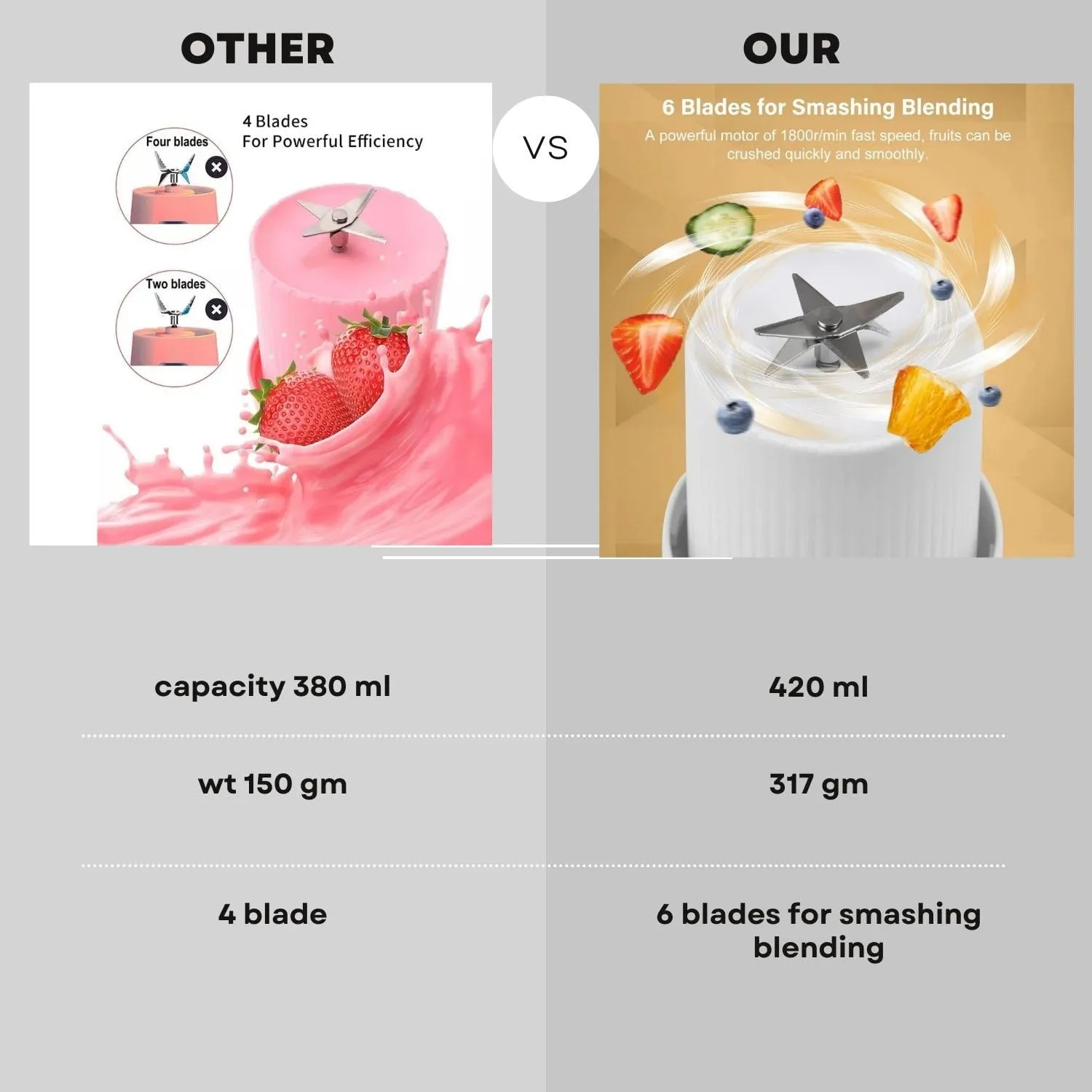 ✔ Powerful Blades – Easily crush fruits, ice, and protein powders
