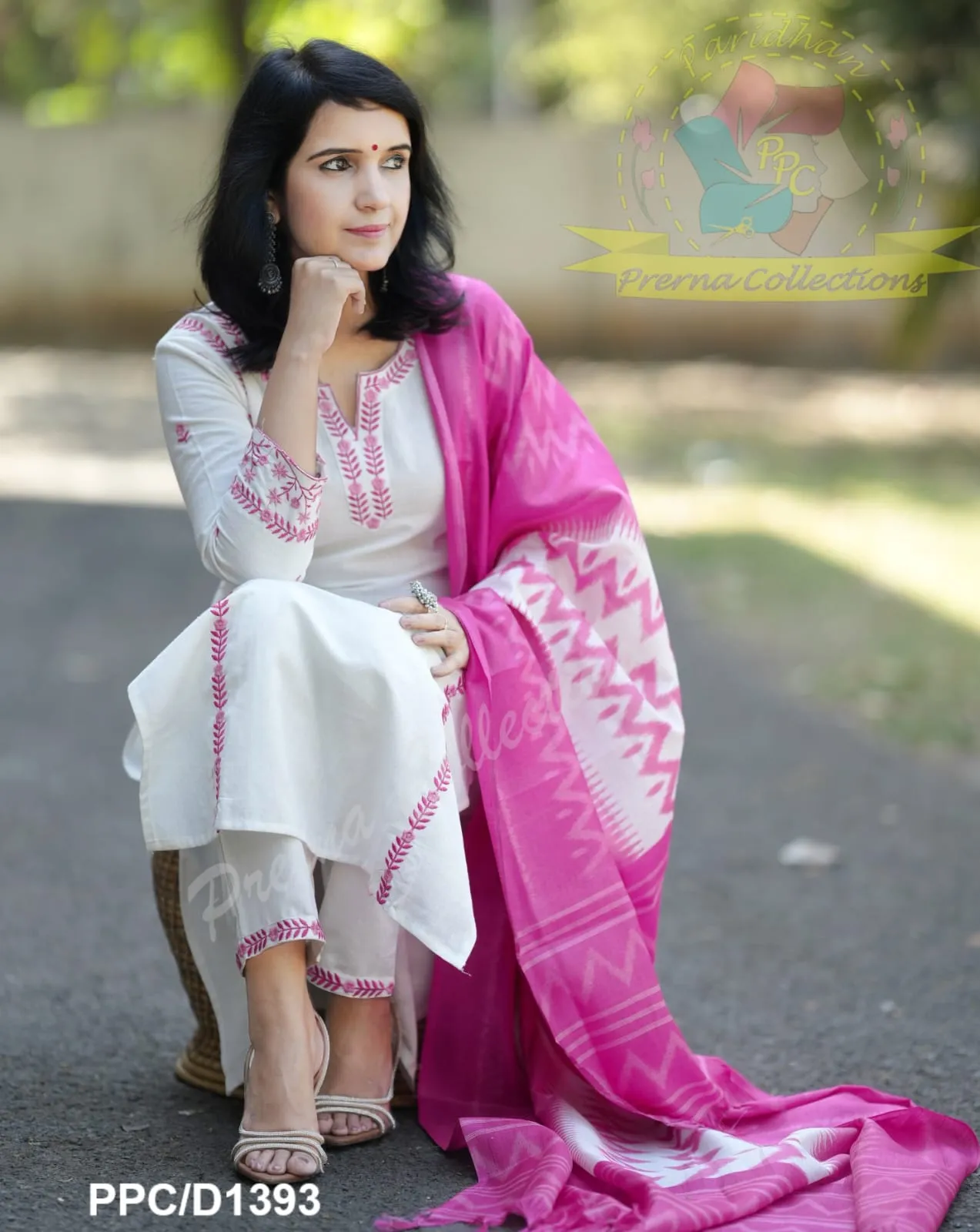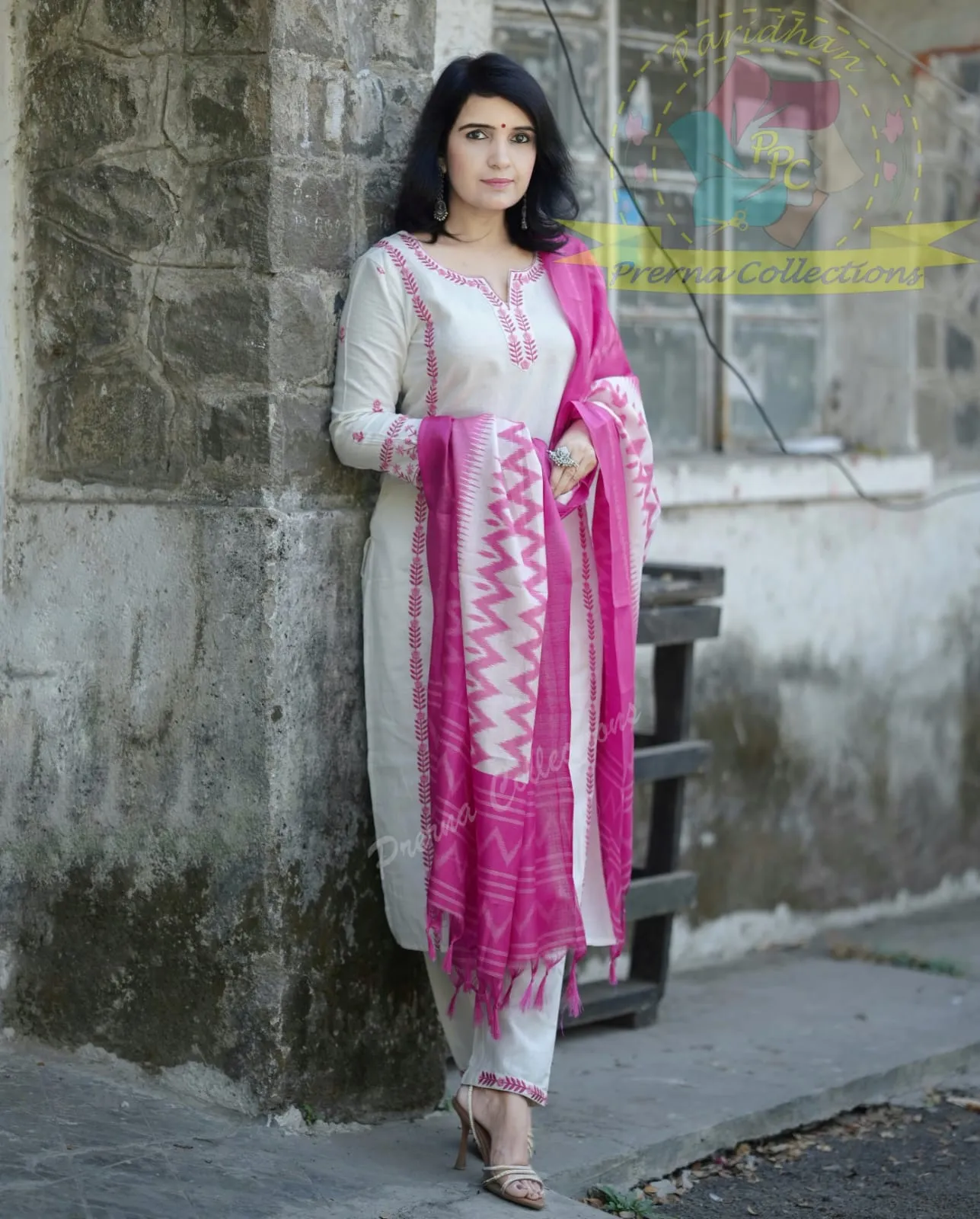 Elevate your traditional wardrobe with this Women\'s Cotton Blend Embroidered Straight Kurta with Pant & Dupatta. Crafted from a premium cotton blend fabric, this kurta set features intricate embroidery work that adds a touch of elegance and sophistication. The straight fit kurta offers a comfortable and flattering silhouette, while the matching pant ensures a modern, stylish finish. The dupatta with detailed embroidery completes the ensemble, making it perfect for festive occasions, casual outings, or family gatherings.