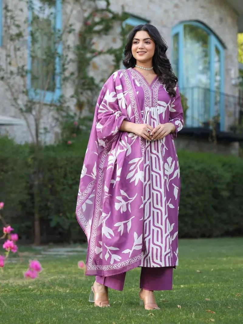 Women\'s Purple & White Floral Printed Cotton Kurta Set with Dupatta