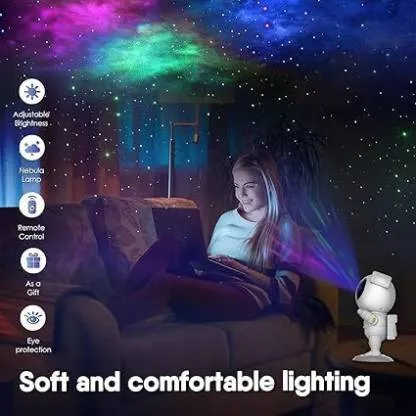 DescriptionAstronaut Projector Night Lamp with Charging, Remote, and Galaxy Changing Light Feature (22 cm, White) Bring the wonders of space into your room with this \"Astronaut Projector Night Lamp\"—a perfect blend of functionality, style, and innovation. Standing at 22 cm, this compact yet powerful night lamp features a unique astronaut-shaped design, making it an ideal addition to any bedroom, nursery, or space-themed decor. The projector feature transforms your room into a stunning galaxy, with a dynamic array of lights that mimic the stars, nebulae, and other celestial bodies. Choose from multiple color options to create a calming atmosphere or a vibrant, energetic vibe. The changing galaxy light feature allows you to customize the projection according to your mood, offering a soothing effect for bedtime or an inspiring display for any occasion. The light projection can cover a wide area, enhancing the visual experience and immersing you in a cosmic journey. Equipped with \"remote control functionality\", this projector allows you to easily adjust settings from a distance. Whether you want to change the light colors, set a timer, or adjust the brightness, the remote ensures a hassle-free, convenient experience. No need to get out of bed or reach up to make adjustments. The \"charging function\" adds an extra layer of practicality. You can charge your phone, tablet, or other devices via the built-in USB port, ensuring your gadgets stay powered up while you enjoy the stellar display. This makes it not only a mesmerizing night lamp but also a functional tech accessory. Made from durable, high-quality materials and finished in a sleek white color, this astronaut night lamp is an eye-catching and versatile addition to any room. Perfect for children, teens, or adults who are fascinated by space and technology, it combines fun, comfort, and practicality in one glowing package.SpecificationsGeneral